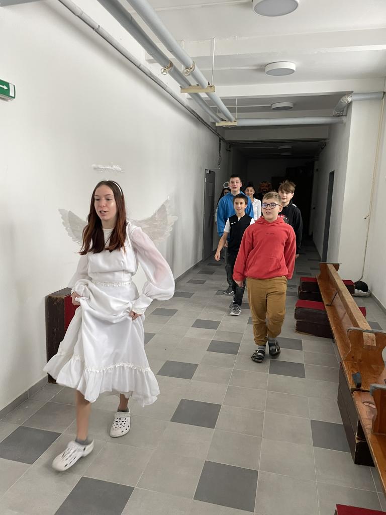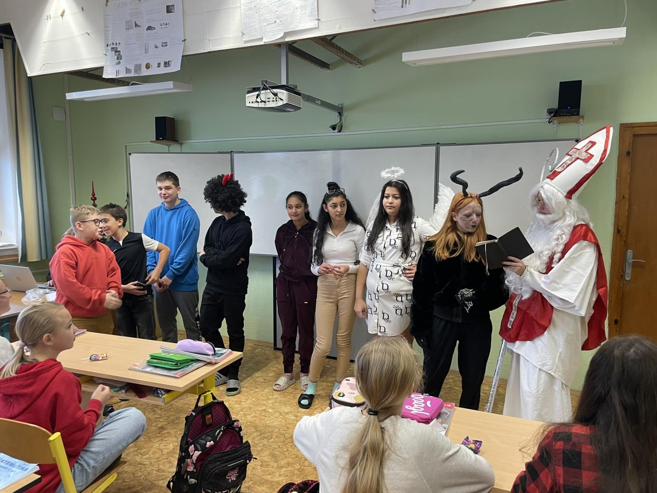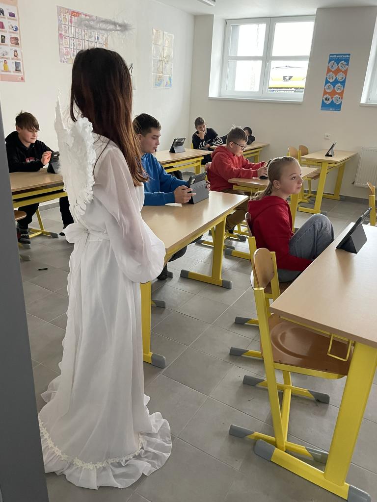 I do naší školy zavítal Mikuláš s andělem a čerty. Těchto rolí se zhostili žáci 9. třídy. První stupeň si užil i mikulášskou stezku.