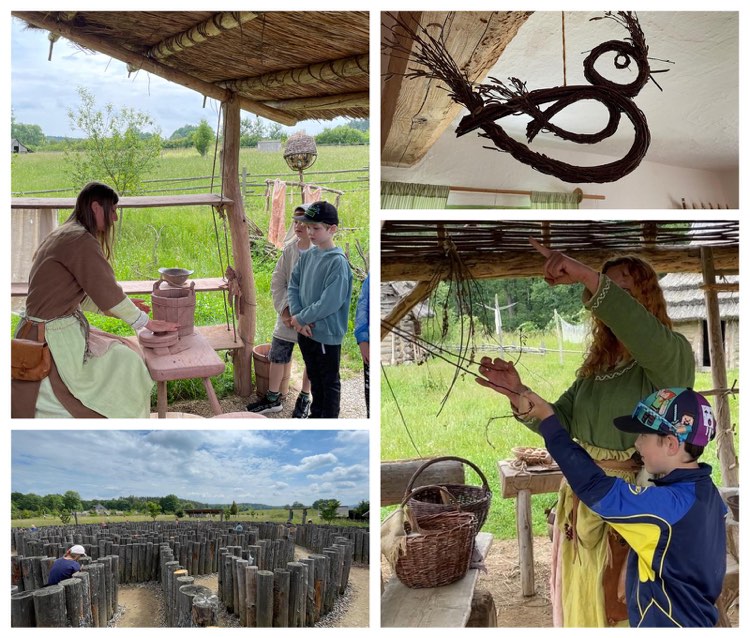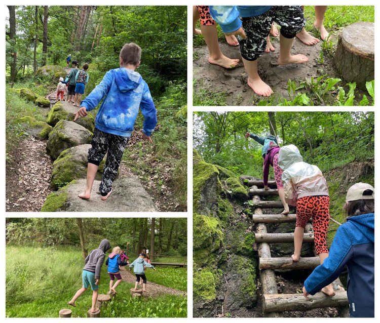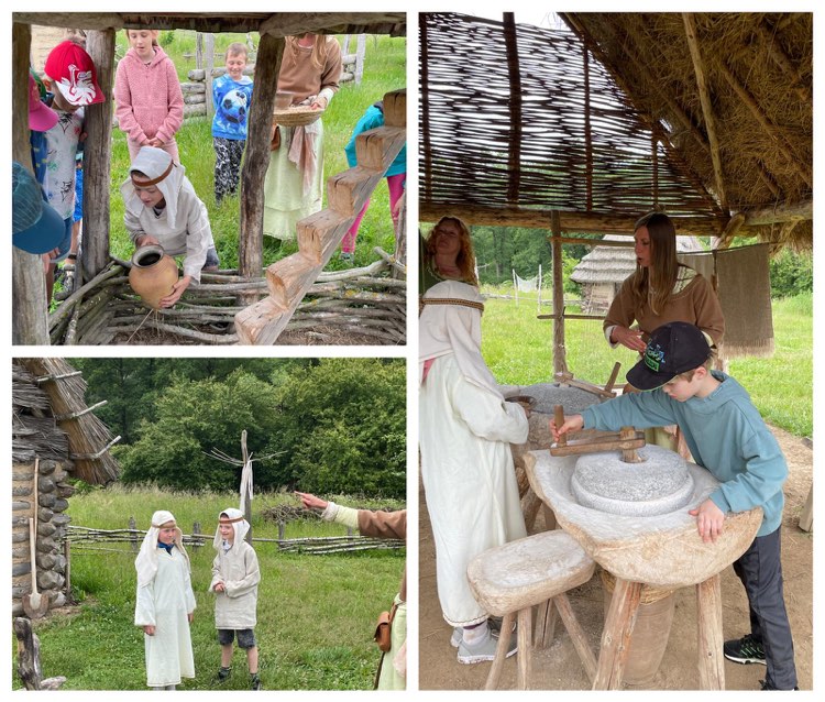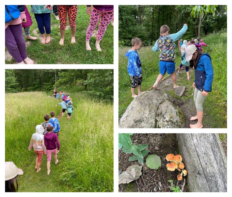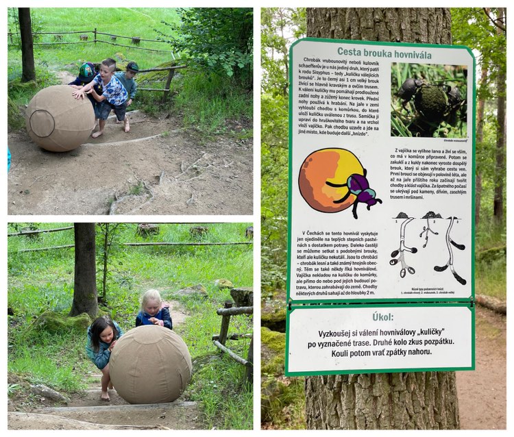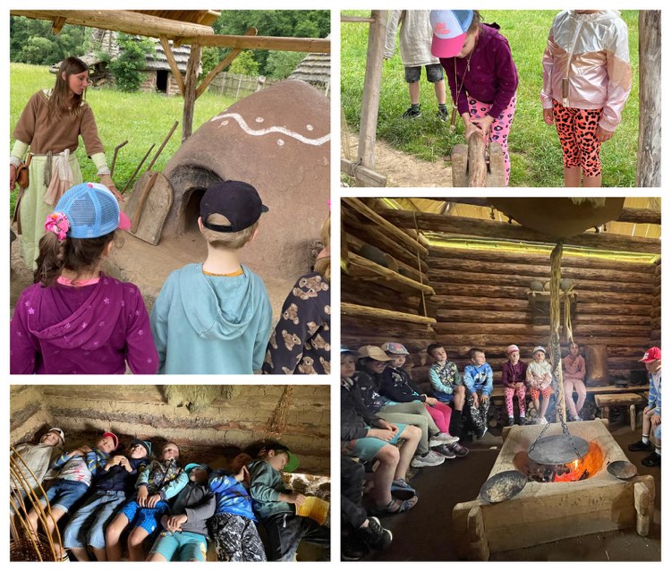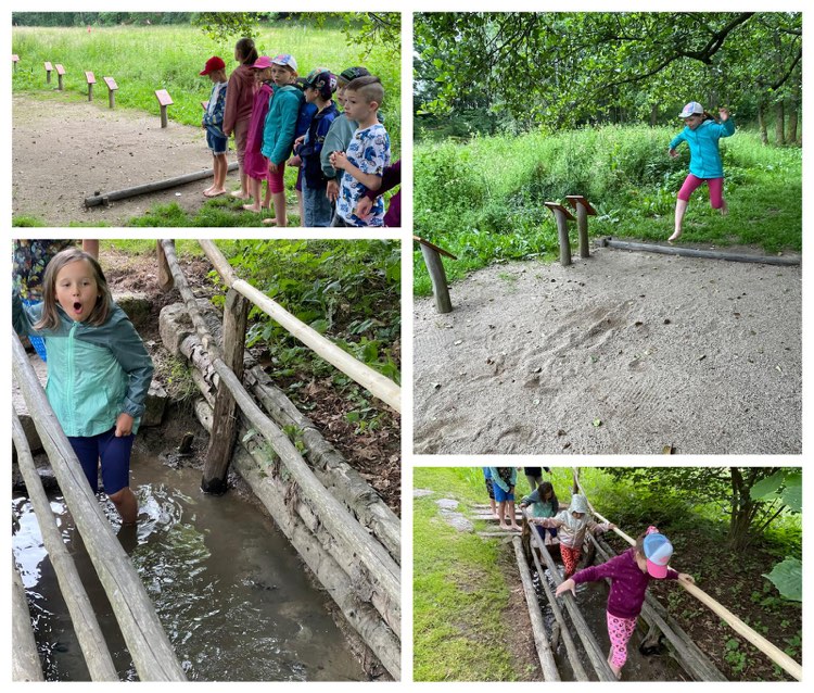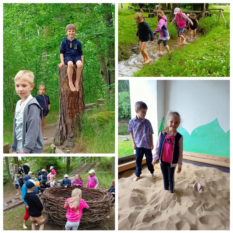 "Vítejte v Zeměráji s žáky ZŠ Zbůch. V naučné části výletu se děti hravou formou seznámily se životem našich předků v raném středověku, s každodenními činnostmi člověka a jeho vlivem na krajinu. Zábavná část pak nabídla chůzi bez bot po kilometr dlouhé stezce naboso, dětskou hernu, velké dřevěné b